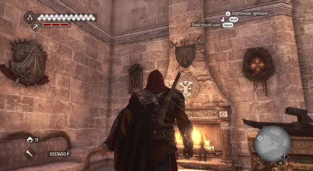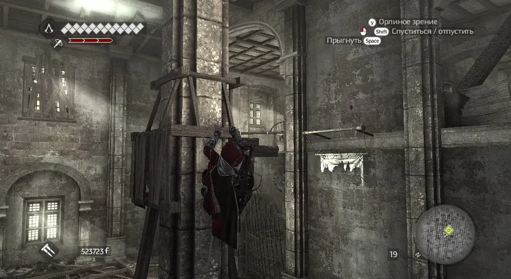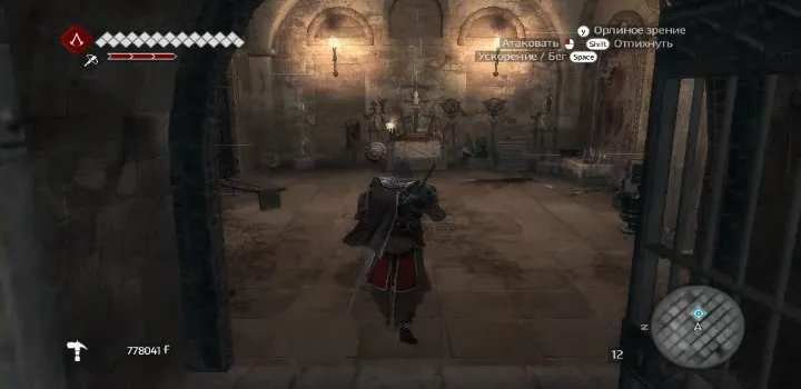 Шон поведал его название – Санта Мария Арагвели. Церковь стоит на месте старого храма Юноны. Забирайтесь на икону Божьей Матери, затем на крест. Дезмонд повернет рычаг, после чего в храме активируются некие механизмы, благодаря которым можно добраться до следующего рычага. Когда закончите акробатические трюки, спускайтесь к ребятам. Дезмонд включит возникший из-под пола очередной механизм. Пол опустится, и вы окажетесь в храме Юноны.