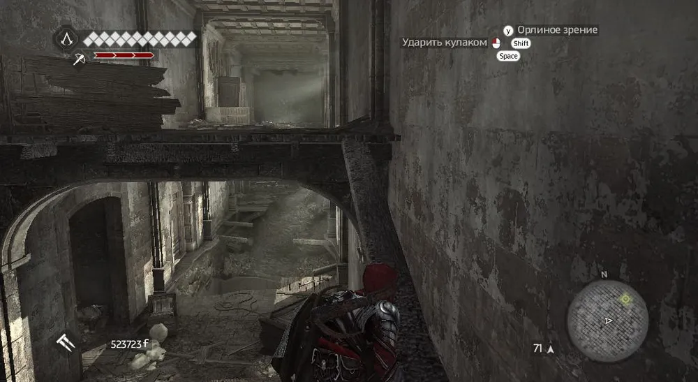 Бежим в открытую дверь. Поворачиваем налево и находим помещение с обрушенным полом. Двигаемся в самый угол. По уступам и перекладинам попадаем на второй этаж.