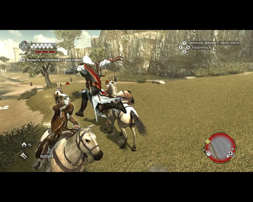 Можно ускакать от них в город или перебить их всех скрытым клинком перепрыгивая с лошади на лошадь.