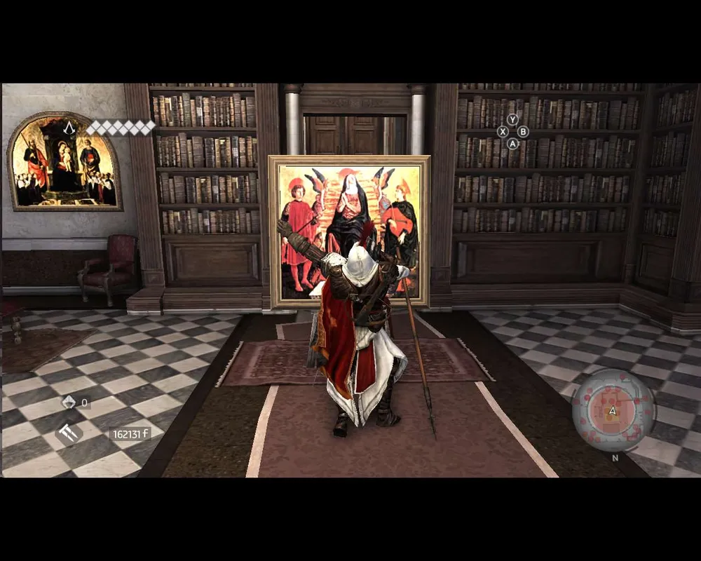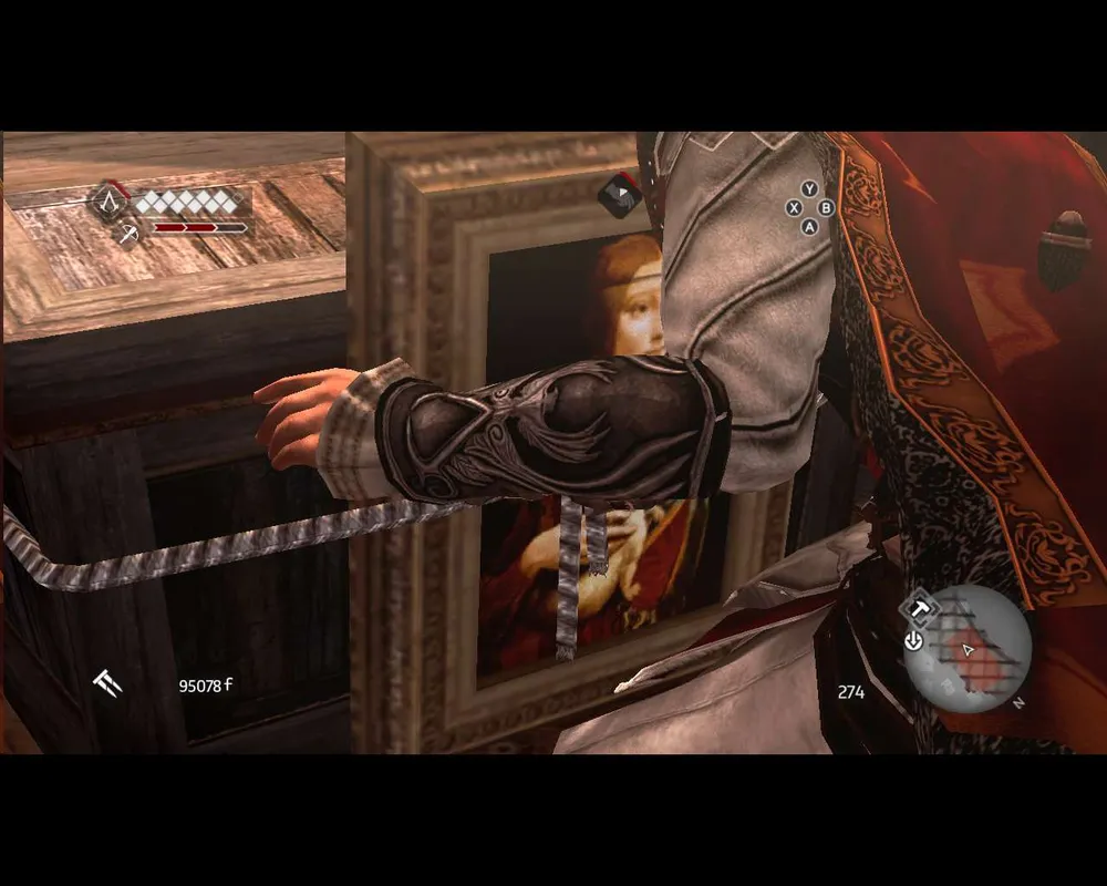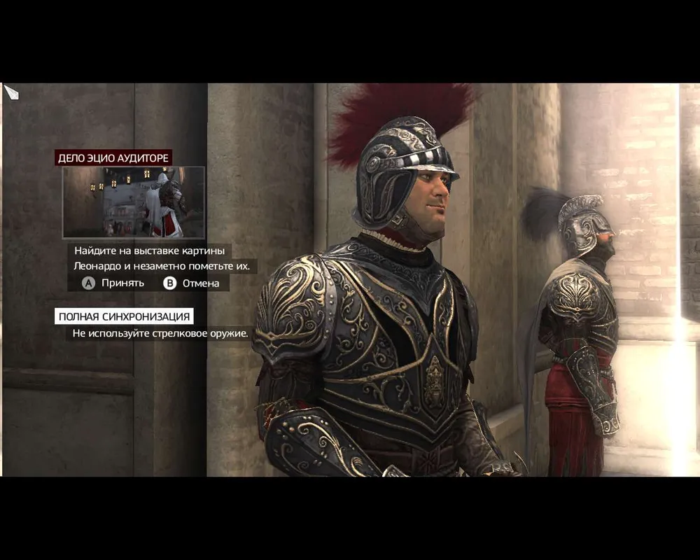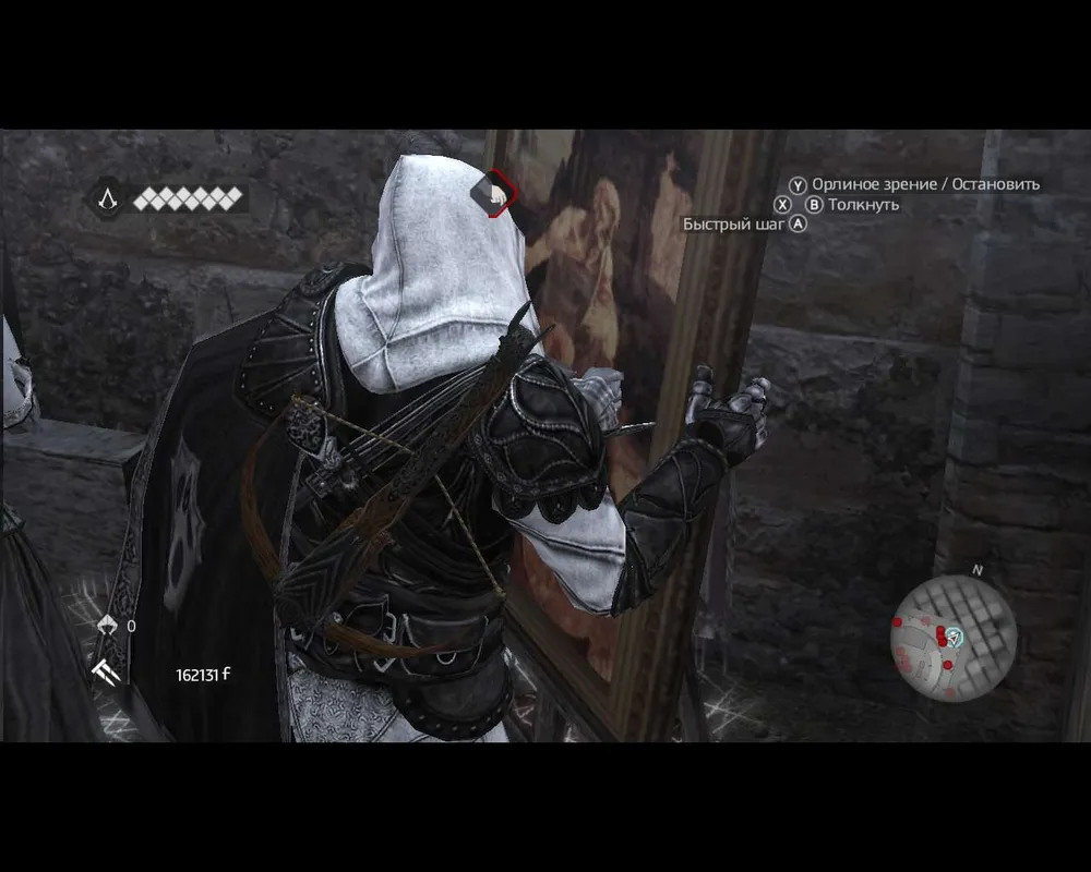 Чтобы найти картины, интересующие Эцио, включите орлиное зрение. Стражник не даст вам подойти к картине, прикажите куртизанкам отвлечь его и незаметно пометьте картину.