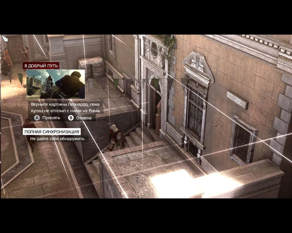 Нужно найти картины до того, как купец отплывет с ними из Рима. Отправляйтесь в порт и разыщите человека, торгующего картинами. По дороге в порт вы встретите тамплиеров, старайтесь не пересекаться с ними, если они вас заметят, полная синхронизация достигнута не будет. Когда доберетесь до порта, включите "Орлиное Зрение", чтобы найти купца.