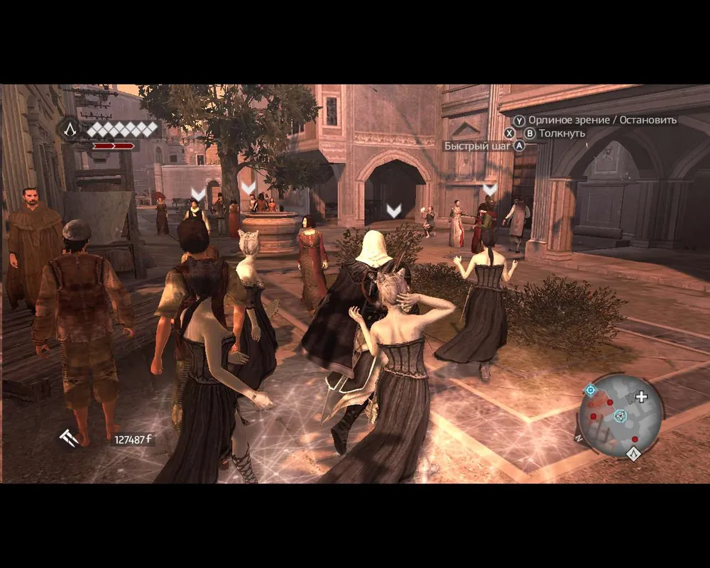 Старайтесь не наталкиваться на людей и избегайте стражников, они могут сбить вас с ног. Когда вы поймаете курьера, Эцио заберет приглашение.