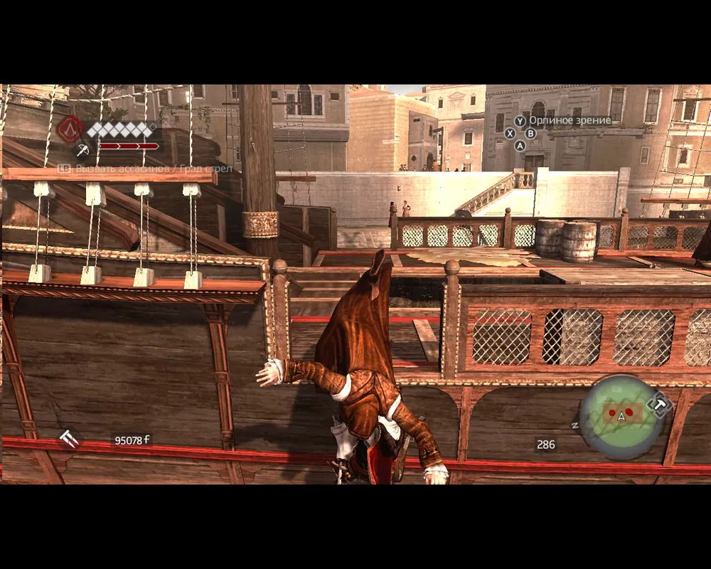 Первым делом, надо забрать картину с корабля, пока её не увезли из Рима. Плывите к кораблю так, чтобы вас не заметили тамплиеры. Залезайте по борту корабля и скидывайте в воду тамплиеров, патрулирующих палубу.