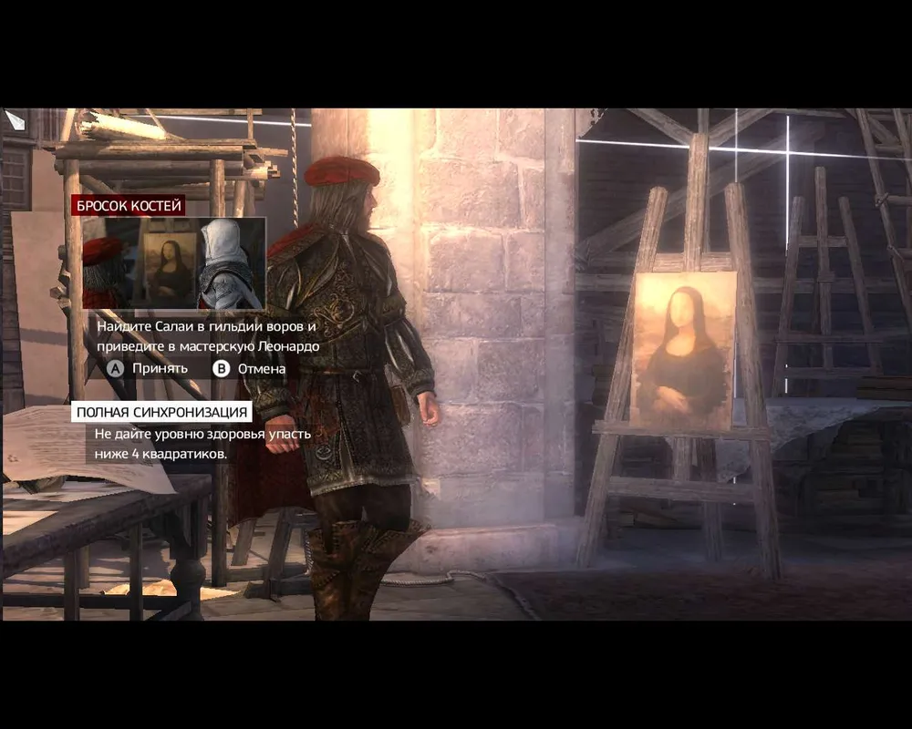 Эцио зашел в мастерскую своего старого друга Леонардо Да Винчи. Последнее время Леонардо увлекся изучением чисел Пифагора. Недавно Да Винчи совершил невероятное открытие, которое он хотел было показать Эцио. Но его помощник куда-то ушел и Леонардо просит Эцио найти его. Леонардо считает, что его ассистент как всегда играет в кости в таверне "Спящая Лисица".