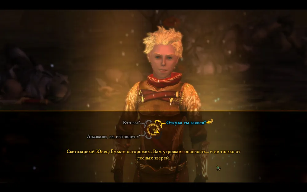 Отправляем бедолаг в переход, а сами идем в Горелесье. В лесу встречаемся со Светозарным Юнцом, который вновь предупреждает нас об опасности и ведает обо всех ужасах что ждут впереди. Плюем на все и идем вперед, кромсая по пути божественных созданий.