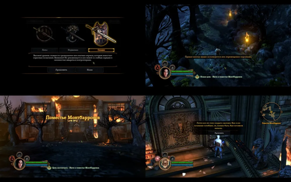 Игра с самого начала подсказывает нам, что нужно нажимать и что при этом происходит, дает задание "Сбор на севере", и мы следуем по дорожке в Поместье Монтбарронов. Поместье в огне, кругом трупы потомков легиона.