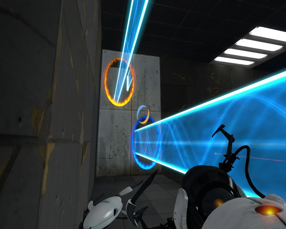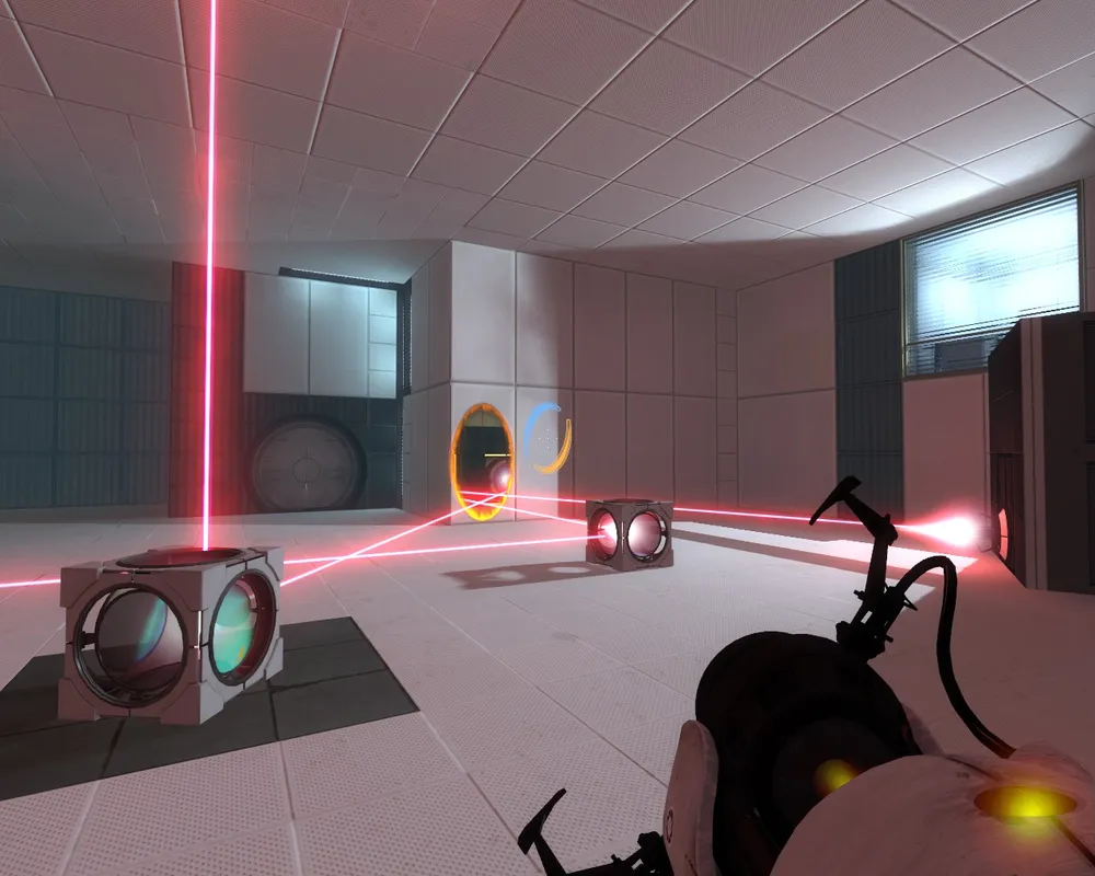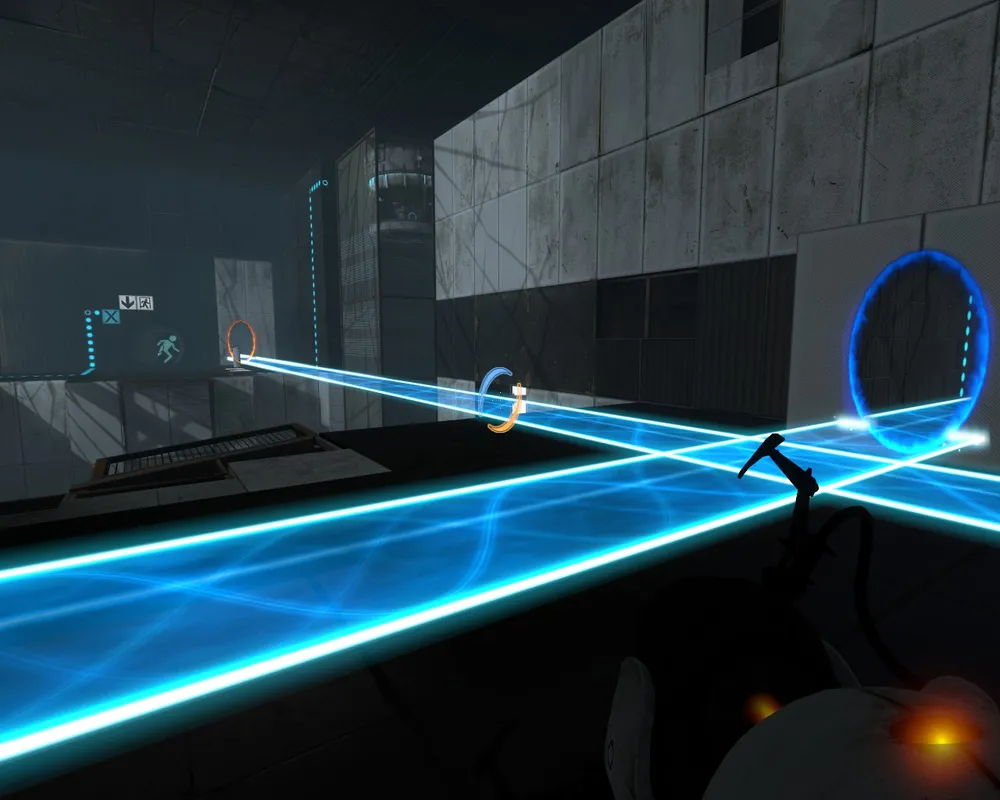 Следующее испытание. Найдите куб преломления и заберите его, создав один портал под ним, другой на стене рядом с вами. Возьмите куб и поставьте вот так: