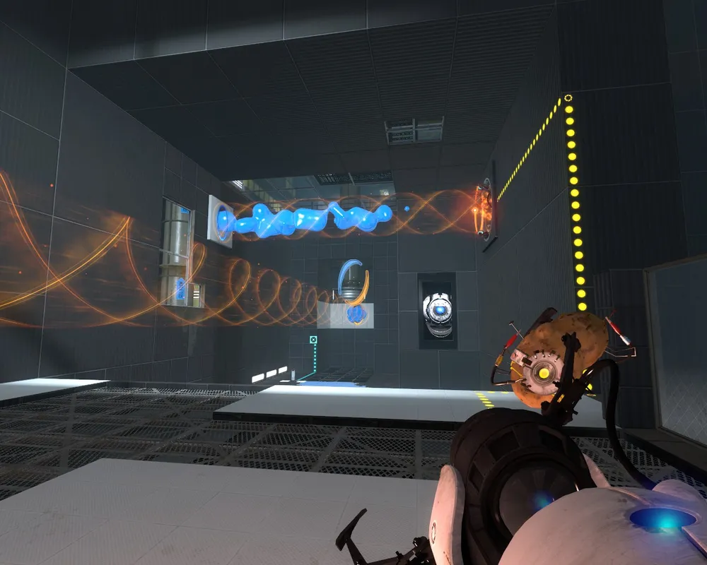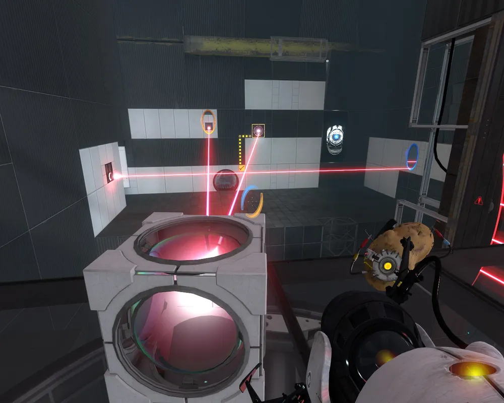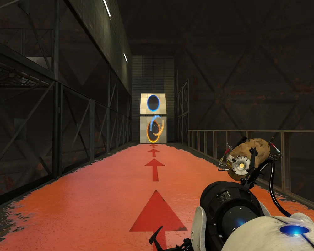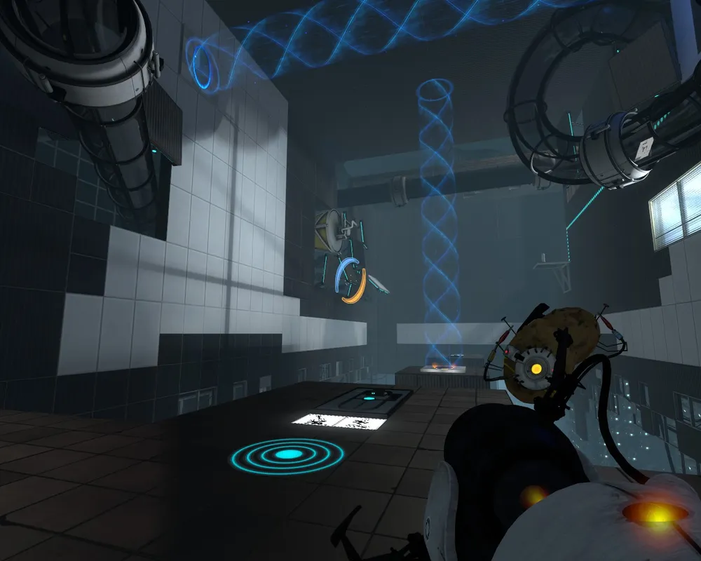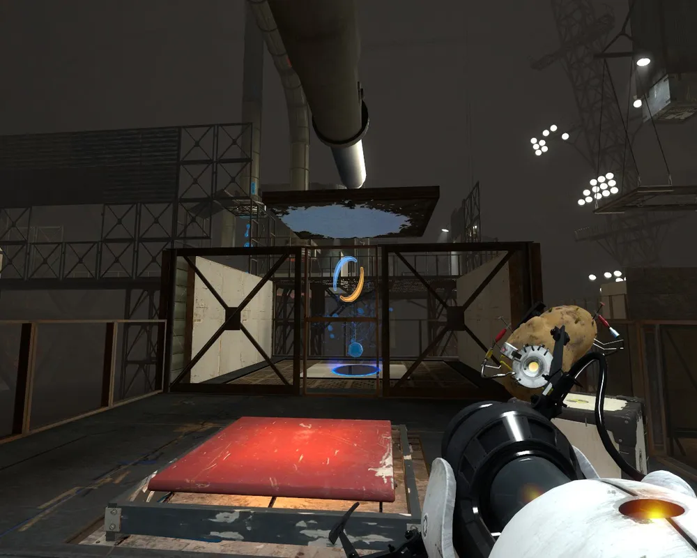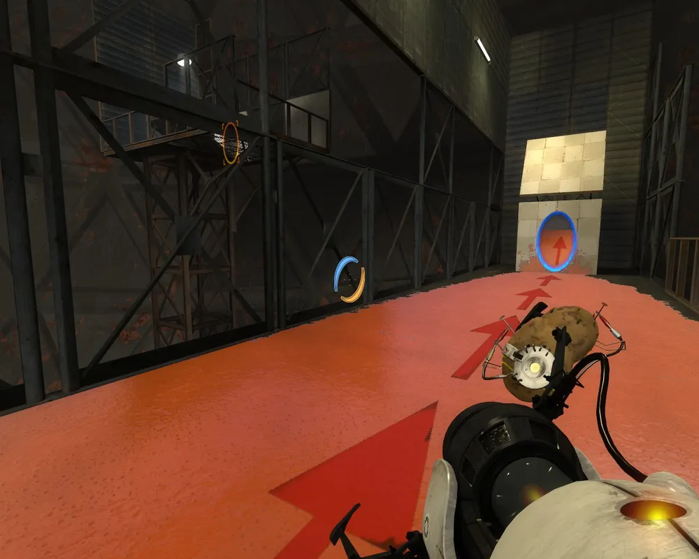 Встреча с картофелиной-ГЛэДОС. Подберите её и долетите до мостика, с помощью порталов.