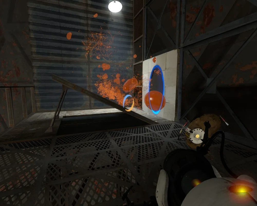 Мы уже дошли до двери выхода. Нужно лишь нажать кнопку. Поднимаемся на верхний мостик. Создаем порталы здесь: