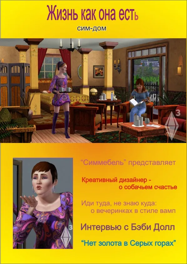 4) На обложке должны быть заголовки статей, ссылки на страницы, название журнала и фотография Сима (или рекламируемого предмета).
