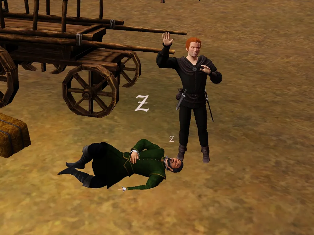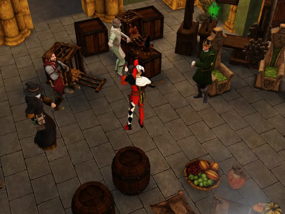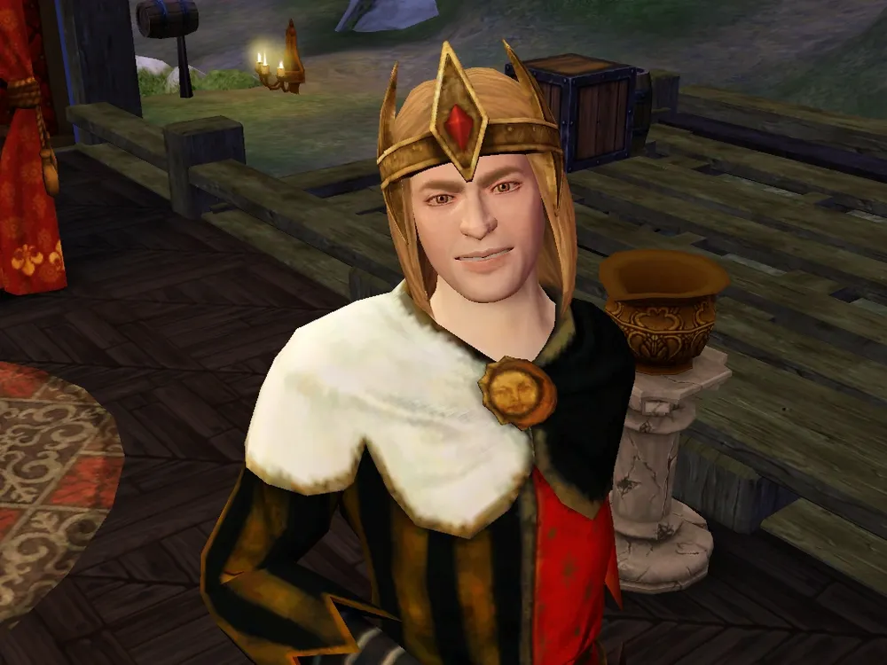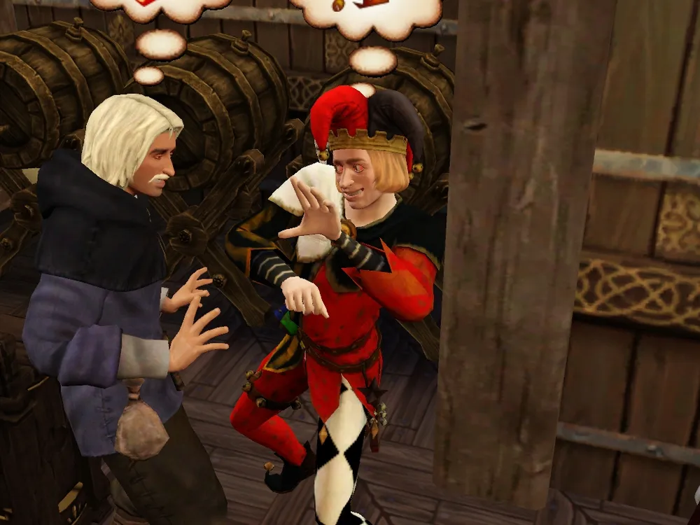 - Эээ, не бери в голову… Хитрые твари, от них всего можно ожидать, знаешь ли. Так, а ещё я, вроде бы («я уже ни в чём не уверен»), вчера женился. Так где же моя, простите, жена? И начинайте поиски шута и короны. Я слегка не в курсе условий управления королевством («я вообще сейчас ничего не понимаю!»), однако, сдаётся мне, корона является одним из необходимых атрибутов и сейчас я, пусть и временно, не король! Вчера перед празднованием оставил её в замке, чтобы, чёрт меня побери, «не потерять»! Шпион, бегом на поиски! Старик, ты знаешь, куда делся шут?!