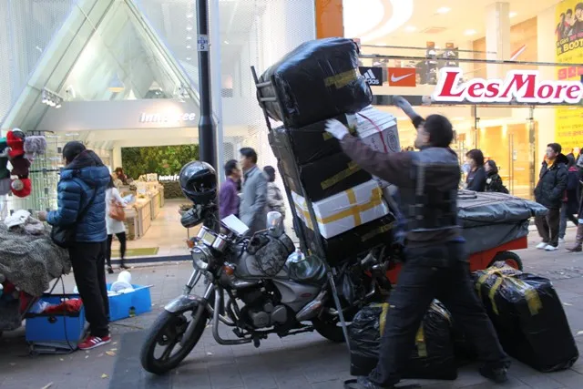 Так выглядит курьер. На задний багажник помещается огромное количество разного барахла! Начиная с пиццы, заканчивая коробками c негабаритными посылками. И обязательный аксессуар — целлофановые перчатки.