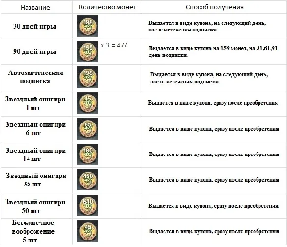 Монеты начисляются также и за покупки в игровом магазине. Каждый потраченный принесет около 10 монет. При этом монеты за оплату подписку приходят не сразу, а только по истечении оплаченного срока (30 или 90 дней).