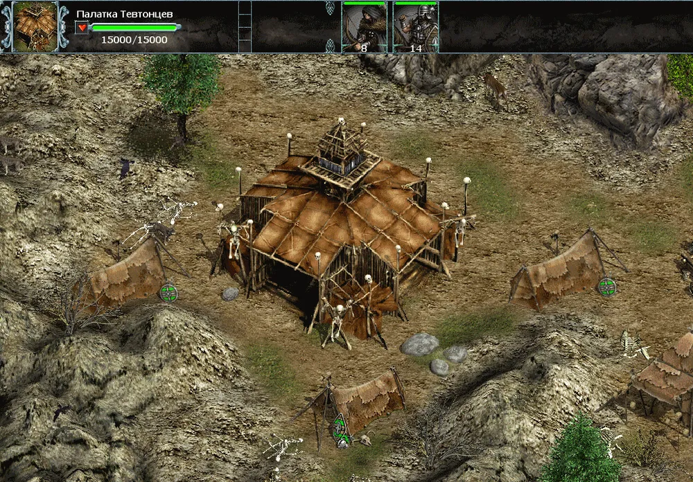 Есть в игре и нейтральные воины. Это Тевтонцы, их палатки разбросаны по всей игровой карте. Если подойти близко к их владениям, то они сразу же нападают, не терпят никого. Обычно в палатке у Тевтонцев сидят двадцать воинов, если одержать над ними победу, то они переходят на вашу сторону, причем в дальнейшем, при гибели уже вашего Тевтонца, он возрождается в своей палатке вновь, и так до бесконечности :)