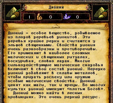 Очень редкий лесной ресурс, дает +3 золота +2 кристалла. Светлый аналог черного лотоса. Если черный лотос нужен был для "великого зла" то дионит для "великого добра"