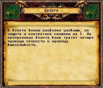 Снижает защиту и контратаку на 1 на преодоление болота воин без навыка знание болот тратит 4ре единицы скорости и единицу выносливости. В болотистых местах вольготно себя чувствуют стрелки до которых противник добирается крайне медленно.