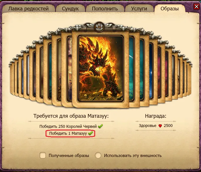 Матазуу, огромное огненное чудовище, самый сильный монстр на 9 уровне, обитает у островов Хранителей. Матазуу использует магию культа Разрушителей (Огненный шар, Взрыв 9 уровня), а так же он обладает собственными уникальные заклинаниями... Огненная лавина - выжигает все черепа на поле, и Беспощадность демона - Матазуу, получая урон, накапливает ярость. Достигая определенного момента — высвобождает ее в один, мощный и беспощадный удар, нанося сопернику сокрушительный удар. Брр.. не хотелось бы попасть под горячую "руку". Характеристики: 500000 здоровья, 300 маны, 3000 урона, 50 доп. маны, удача - 5, ярость - 5, блок - 5. В случае победы принесет один предмет - "Кровь Матазуу", либо "Озверин" (совершенный или уникальный). +405 опыта и 5000 кристаллов