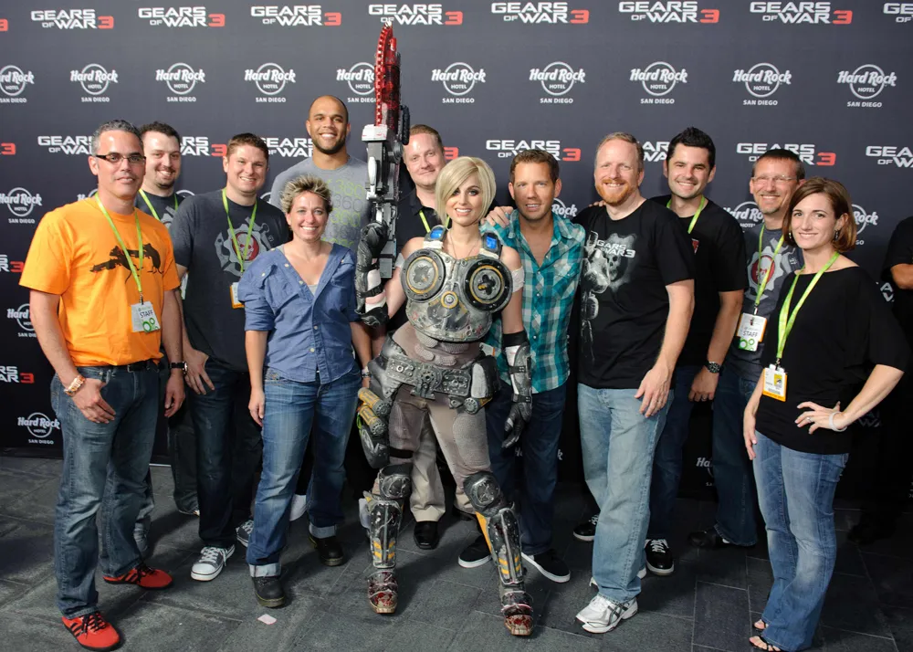 Меган в образе Ани Страуд вместе с командой Epic Games