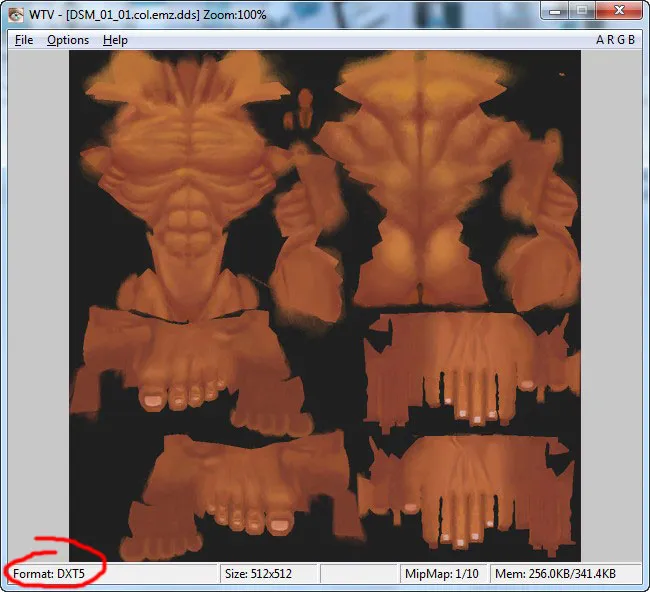 Извлекаются они всё тем же Extract'ом, вот только незадача: на выходе мы получаем формат *.dds доныне нам не известный. С сайта NVidia можно скачать просмотрщик этого формата, он же нам понадобится для определения формата сжатия текстуры.