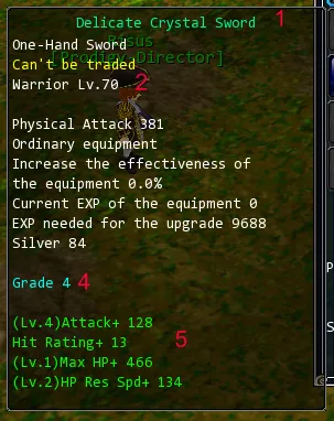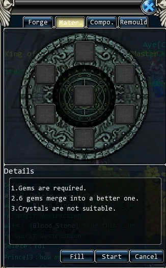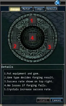 В данном окне производится заточка и улучшение предметов. Для заточки предметов используются синие, зеленые и красные камнями (Emerald, Sapphire, Ruby). Для повышения вероятности успешности действия используются специальные кристаллы (Crystal), повышающие вероятность на несколько процентов за каждый вложенный камень (вложить можно не более 25 кристаллов за 1 раз).