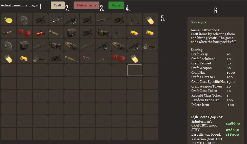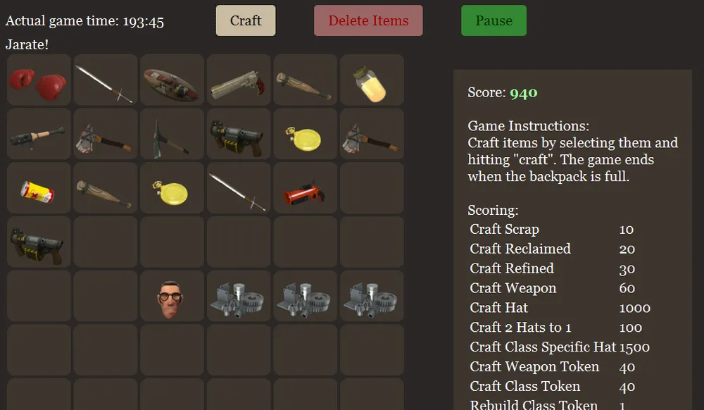 В игре Team Fortress 2 есть возможность крафтить вещи. С помощью этой способности мы можем получить себе шапку или оружие, которого нам не хватало. Так вот, в этой craft-игре мы можем сделать абсолютно то же самое, что и в обычной игре. Только тут время идет быстрее: 1 час = 3 секундам. И поэтому здесь у нас нету ограничений, мы можем спокойно крафтить, столько, сколько нам нужно. В игре действует те же рецепты, что и в оригинале. Игра заканчивается лишь в том случае, если рюкзак полностью забит. Можно попытаться собрать все шапки или только один вид оружия, в общем возможностей для творчества достаточно. Вдобавок в игре идет соревнование по очкам, о том как их получить ниже.