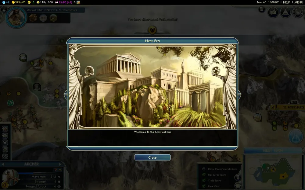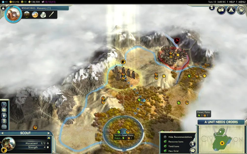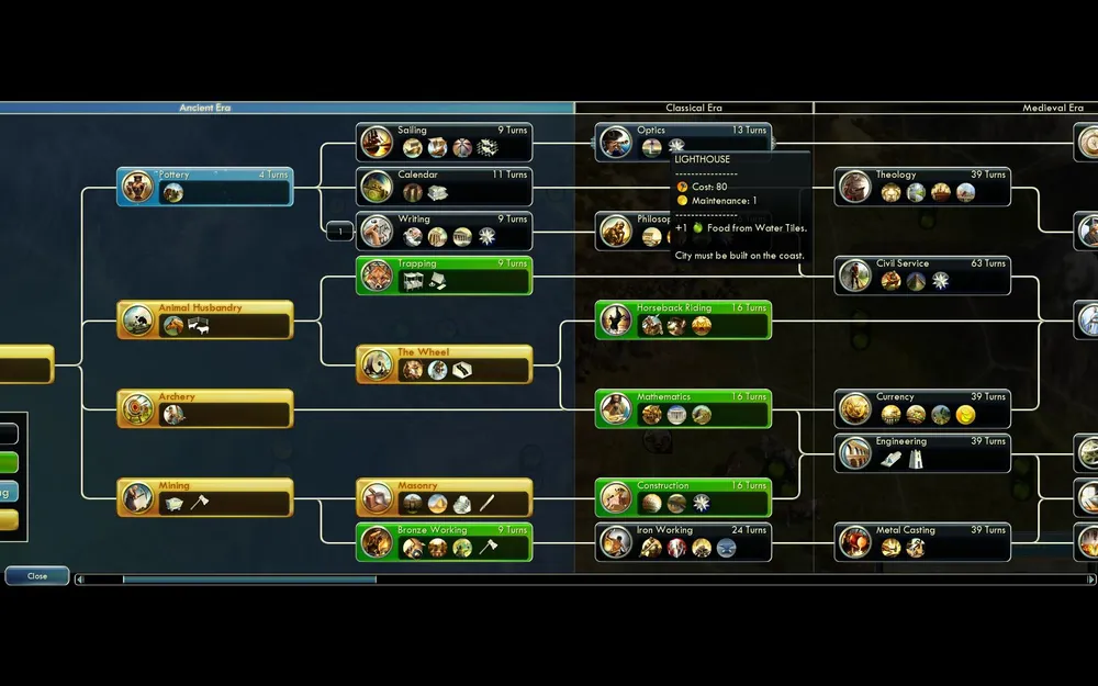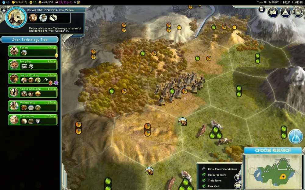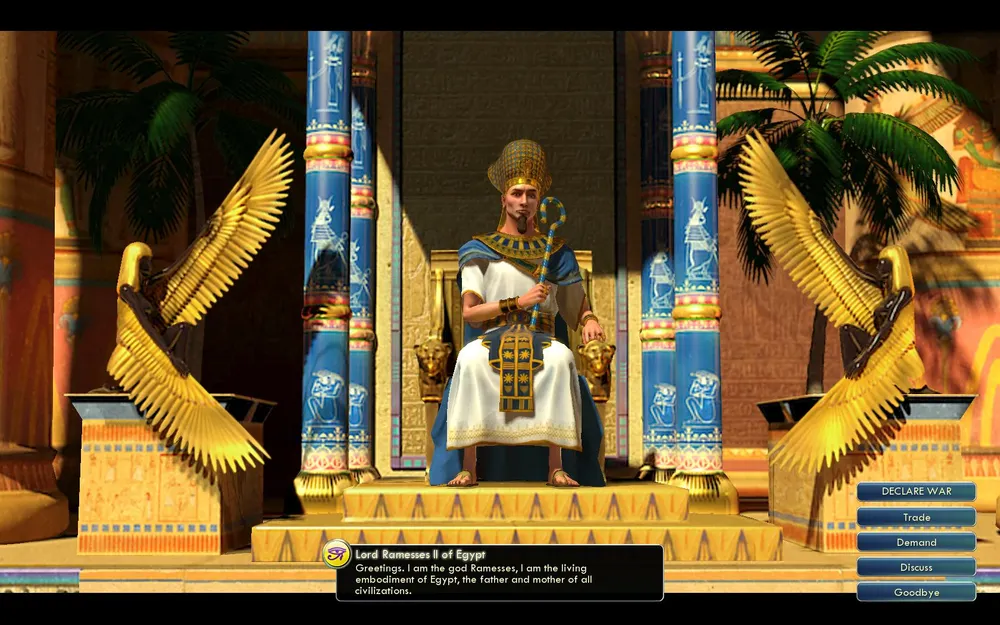 Чтобы развить мощную и сплоченную империю в Civilization V, придется просчитывать все свои действия буквально на два шага вперед. Минуя главное меню, вас уговорят принять первое важное решение в игре — выбрать нацию, над которой вы возьмете шефство. Всего в Civilization V представлено 18 народов и у каждого из них есть лидер с собственными уникальными бонусами. Положив глаз на американцев с их предводителем Джорджем Вашингтоном, ваш арсенал военных юнитов обогатится несколькими эксклюзивными экземплярами, а в нагрузку также получите незначительную скидку на золото. А восхитившись, например, харизмой Рамзеса II — вождя египтян — подневольный народ научится строить чудеса света на 20% быстрее. После того, как вы определитесь с лидером державы, следует разобраться с путем развития собственной цивилизации. Отличия от прошлых частей сериала — наличие политического древа империи.