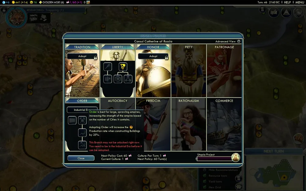 В Civilization V существует 10 карточек, каждая из которых соответствует определенному политическому строю, а точнее, вектору, в котором будет развиваться ваша империя. Выбрав понравившуюся, игрок получает определенные бонусы, причем награды эти могут быть совершенно разные — от диковинных юнитов, до солидных бонусов к прокачке определенной ветви древа исследований. Например, если вам по душе демократическая модель, то вы без труда поднатореете в умасливании послов, воспитаете самый счастливый народ на свете и может когда-нибудь у вас родится свой Том Круз. Для тех же, кто с детства влюблен в свастику, знает наизусть устав немецкой НСДРП и мечтает в зрелом возрасте отрастить ухоженные усики — в Civilization V есть свой, милитаристский путь, с послушным к любым правительственным чудачествам народом, военным превосходством над остальными игроками и вполне осуществимой мечтой с досрочным выполнением плана «Барбаросса».