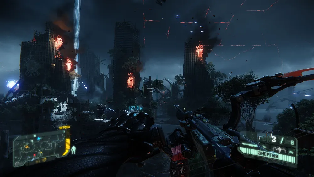Оружие по большей части было перенесено из Crysis 2, причем за 24 года арсенал не изменился даже внешне. K-Volt, SCAR, Grendel, SCARAB, Feline – знакомые все названия, не правда ли? Но имеются и уникальные образцы как обычного, так и инопланетного вооружения. Инженеры с человеческим лицом породили многоствольное реактивное орудие под названием Typhoon – самую настоящую “швейную машинку” с поистине бешенной скорострельностью. Инженеры с инопланетной мордой (или кто там им оружие штампует) привнесли в мир игры сразу несколько специфических орудий для порабощения двуногих гуманоидов, в том числе и аналоги снайперских и обычных винтовок, а еще ручной миномет X-PAC, уничтожающий противника с одного удачного попадания. Отдельная тема для разговора – тот самый “уберпапский” лук, мощно распиаренный еще задолго до выхода Crysis 3. Это оружие эффективнее многих автоматов и иже с ними пистолетов-пулеметов, хотя есть и недостаток – тетиву таки надо натягивать. Но это с лихвой компенсируется четырьмя типами снарядов под самые разные задачи. Наитолстейшие Бомбардиры откидывают лапы после двух-трех стрел с термитными наконечниками, а благодаря электрическим стрелам можно убивать целые группы врагов, если они в этот момент находятся хотя бы по щиколотку в озерце, речушке или болотце. Электропроводимость водички-то никто не отменял. Также для лука предусмотрено несколько режимов стрельбы, будь то сильное натяжение тетивы с усиленным уроном или же слабое натяжение с меньшим уроном, но с большей скорострельностью. Но главное, что стрельба из лука не выводит из режима невидимости, так что при должном усердии можно перестрелять половину локации и остаться при этом незамеченным.