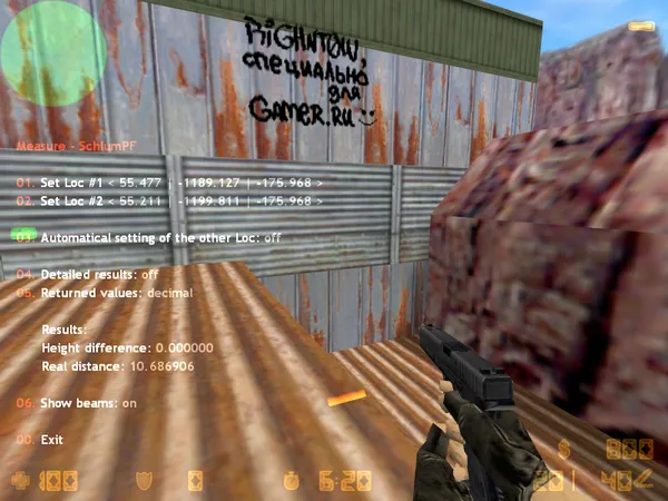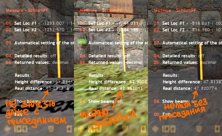 Длина стандартного прыжка вперед с приседанием составляет 215 юнитов. Скорость бега с ножем, пистолетами, гранатами, бомбой, пустыми руками, автоматами с 3-1 (T и CT) по 3-3 — 250 юнитов в секунду. Т.е. не важно, нож или пистолет у вас в руках — их скорости равны. Высота модели игрока — 73 юнита, ширина — 33, высота в приседе — 37, макс.высота, на которую можно забраться прыжком, — 45, а прыжком с приседанием — 63.