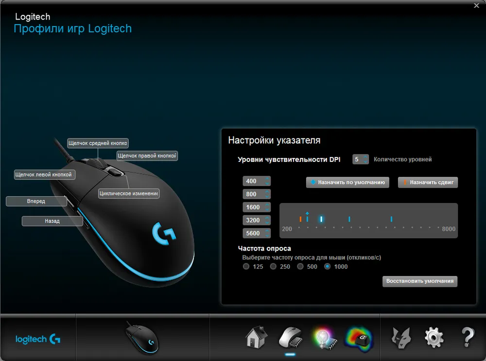 3) Настройка частоты опроса и значений чувствительности сенсора, а также изменение количества шагов циклической смены последнего. Диапазон физических разрешений сто второй варьируется от 200 до 6 000 dpi с шагом в 50 единиц. После установки последней на дату публикации поста версии приложения – 8.96.88 от 26 октября 2017 г. – максимально возможное значение разрешения сенсора повышается до 8 000 dpi. Правда, достигается подобное увеличение чувствительности за счет программных средств, и для этого мышь потребуется перепрошить.