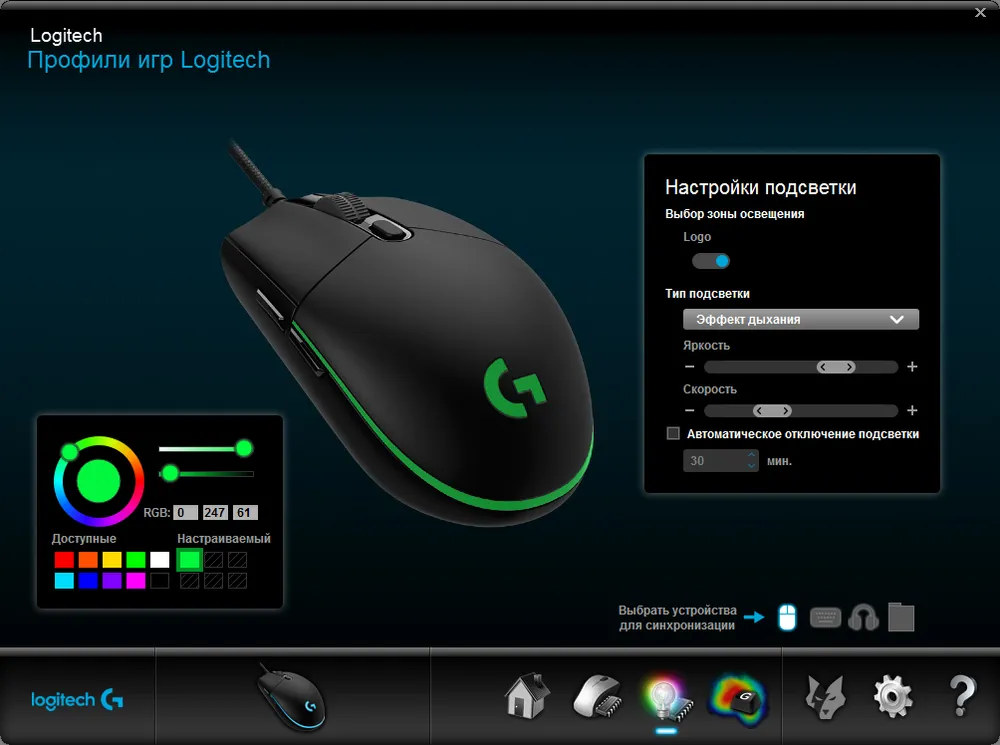 4) Настройка режима и оттенка свечения. Несмотря на то, что зон подсветки у G102 Prodigy две – логотип на корме и полоса, отделяющая верхнюю поверхность спинки от боковой, их раздельная настройка не предусмотрена, в отличие от старших игровых моделей мышей Logitech. Мигать и светиться обе зоны будут синхронно и единым цветом. К вашим услугам имеются 16,8 млн оттенков и два режима свечения: цветовой цикл (последовательная смена семи предустановленных цветов) и однотонное «дыхание» (конкретный цвет настраивается самостоятельно). Также можно отрегулировать яркость свечения, скорость смены цветов и «дыхания», установить время до автоматического отключения подсветки или же совсем ее вырубить.