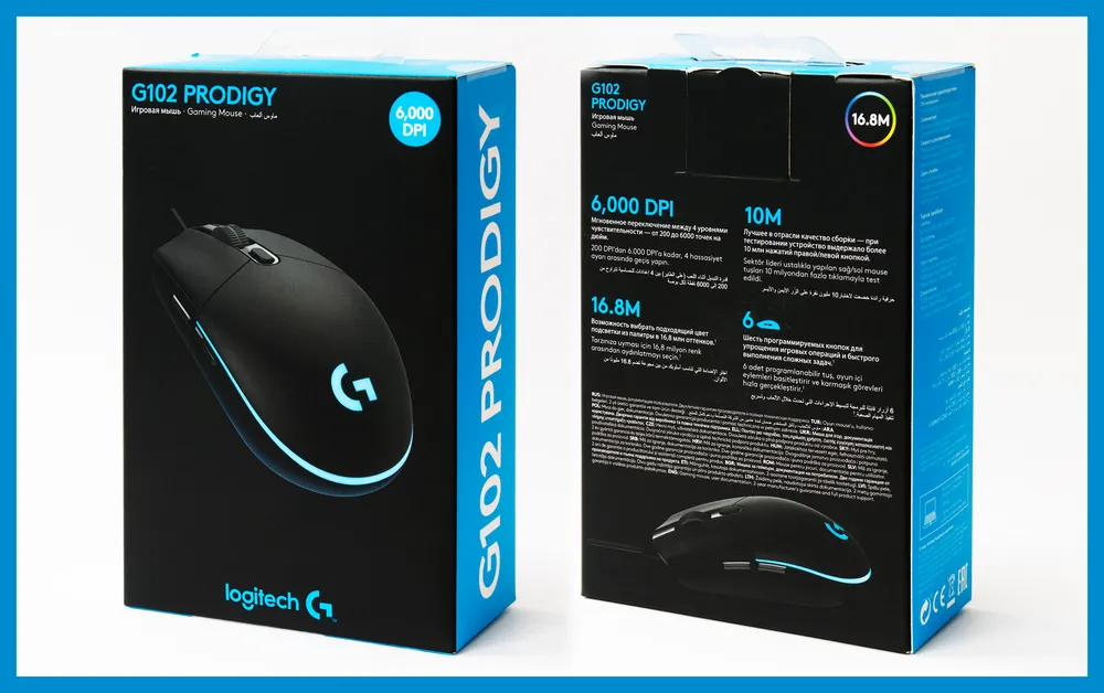 Упаковка G102 Prodigy – пример удачного сочетания бюджетности и стильности. Поставляется мышь в небольшой (чуть больше ее собственных размеров) коробке из тонкого, но плотного картона, оформленной в стандартном для геймерских девайсов от Logitech стиле, в основе которого лежит черно-бело-голубая цветовая гамма. На передней стороне изображено само устройство, а также указаны наименование модели и максимальное физическое разрешение сенсора. На задней стороне перечисляются наиболее значимые, с точки зрения производителя, особенности продукта на русском, турецком и арабском языках (похоже, в Россию поставляется версия, выпущенная для азиатского рынка, что и на цене не преминуло отразиться). Более подробные технические характеристики – правда, оооочень мелким шрифтом – приводятся на одной из боковых сторон на тех же трех языках. Другую боковую сторону целиком занимает наименование содержащейся внутри модели крупными буквами.