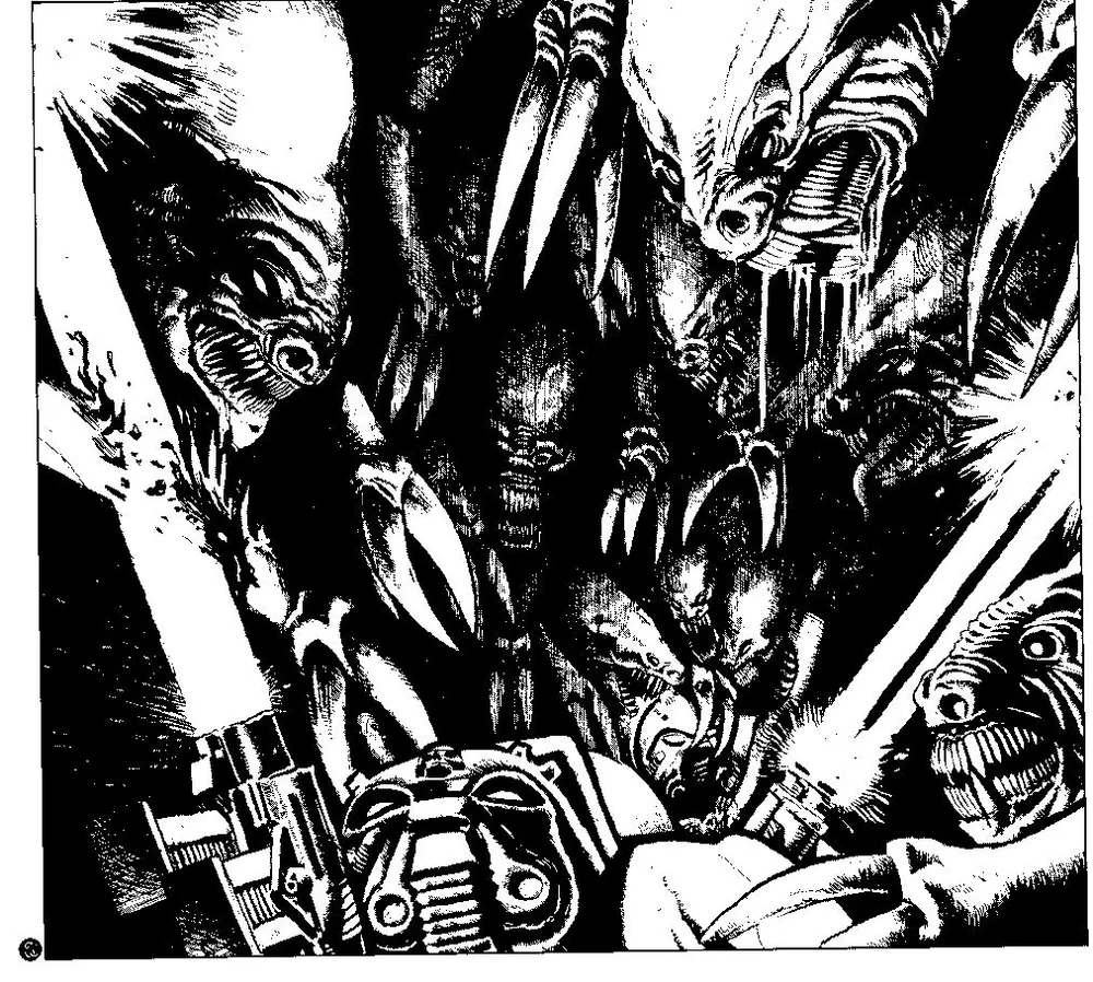 Они обходили нас по соседним коридорам, падали из вентиляционных шахт. Орды генокрадов и гибридов нападали со всех сторон. Они с ослепительной скоростью валили вперёд, угрожая задавить нас числом. Ужасное зрелище — море бронированных тварей, несущееся на тебя, невзирая на уничтоженных собратьев.