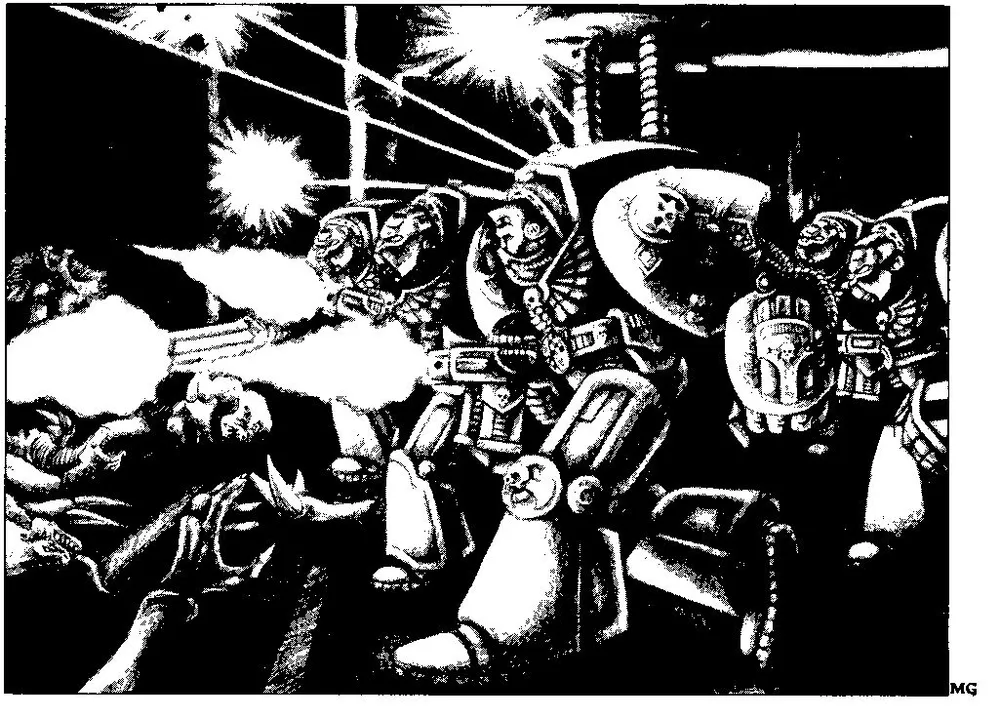 Но и так нам пришлось довольно туго. Раненый Хромой Медведь упал, а я лицом к лицу столкнулся с огромной бронированной тварью. Вожак ударом мощного когтя вышиб у меня меч из руки. Я поблагодарил Императора за пальцевое оружие в силовой перчатке и выстрелил чудовищу в глаза отравленными иглами, ослепив его. Передышки мне хватило, чтобы поднять штурмболтер и пристрелить врага.