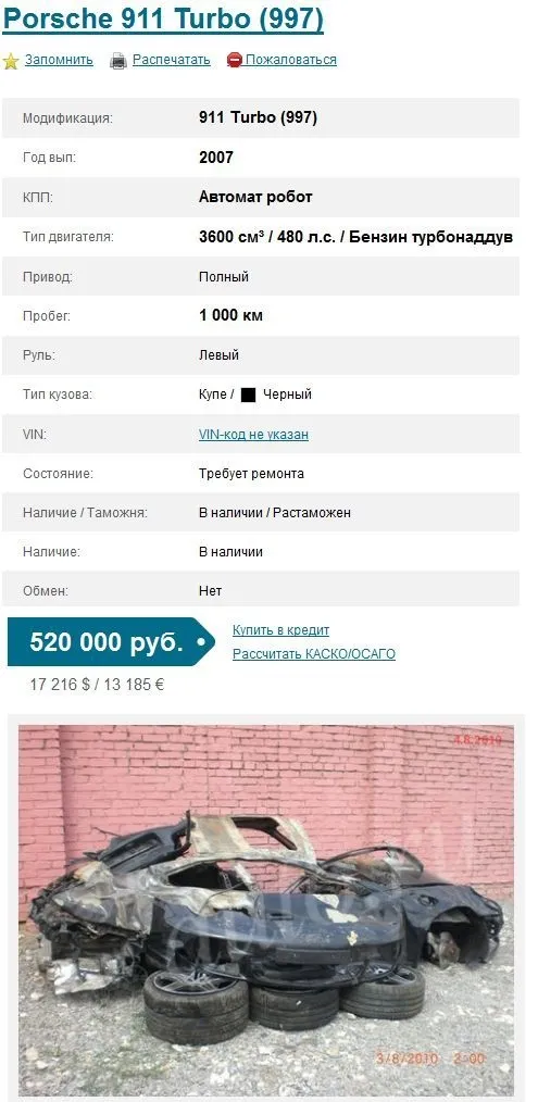 На одном сайте по продаже авто появилось обьявление о продаже Porsche 911 Turbo 1997 года выпуска всего за 520000 рублей.Но есть маленький нюанс- авто находиться в городе Пенза, ну и пожалуй самый маленький пустяк- необходим легкий косметический ремонт: