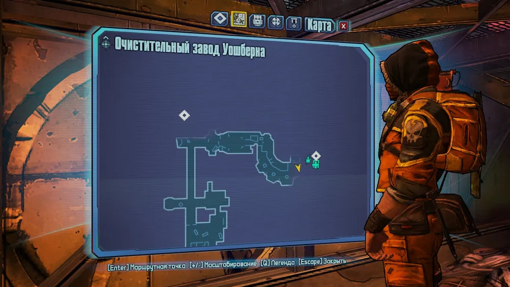 1. Под мостиком, указанным на карте. Прыгайте в воду и идите под него. Символ наверху.