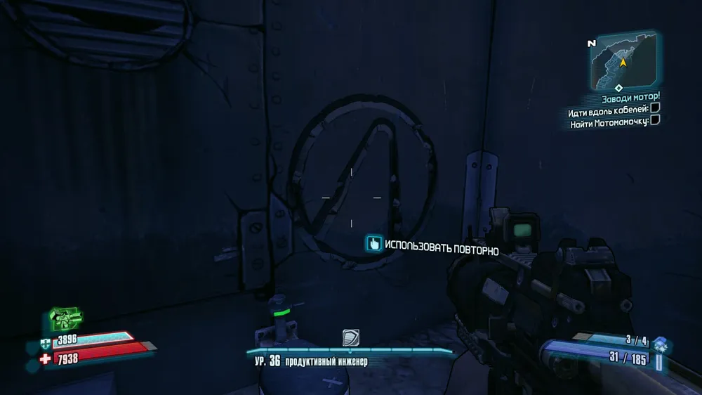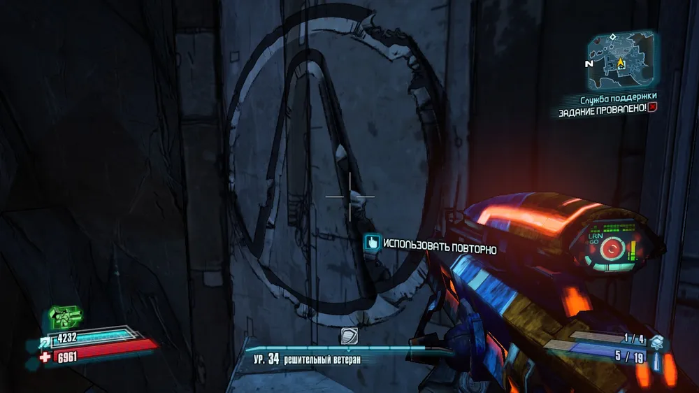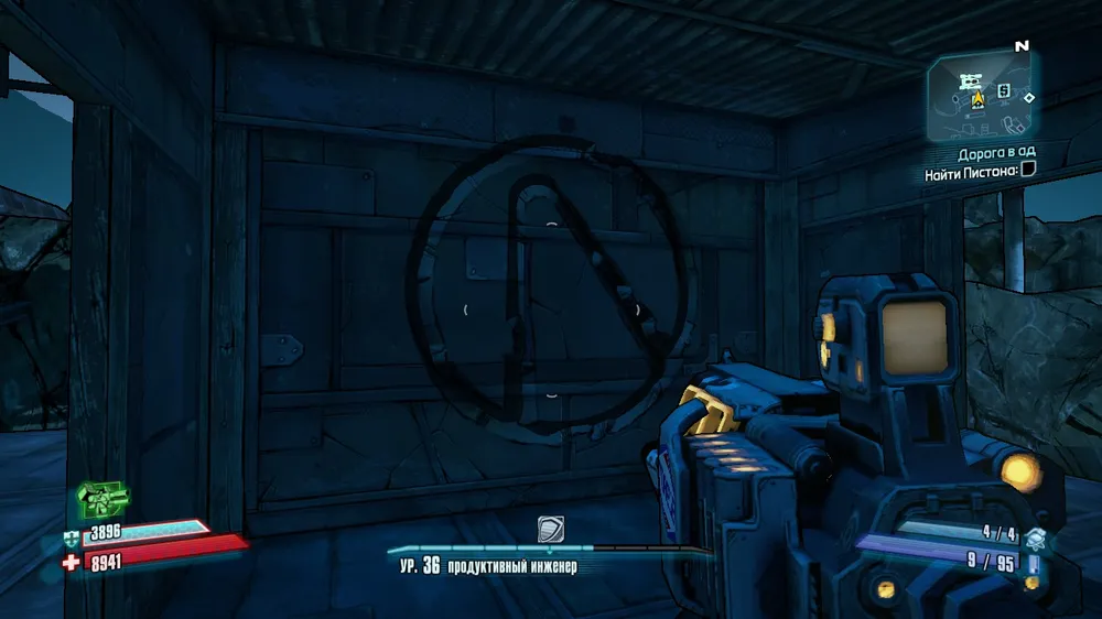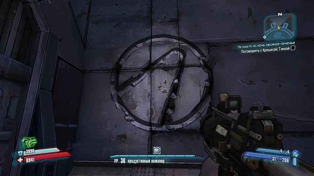 Спустившись на лифте, поворачиваем направо и прыгаем на пристройку. Символ на стене.