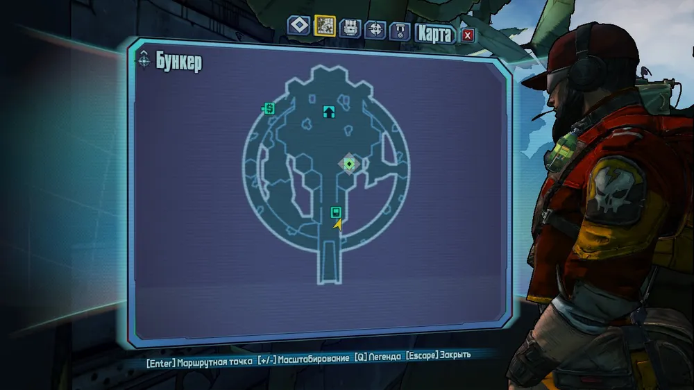 2. В районе большой спутниковой тарелки. Бежим мимо тарелки и далее по железному мостику. Символ на скале, за сундуком с сокровищами.