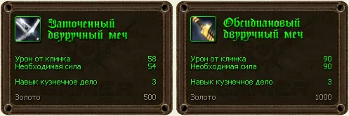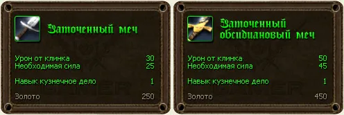 Для обсидиановых мечей потребуется еще немного золотых монет: 10/20/30 соответственно.