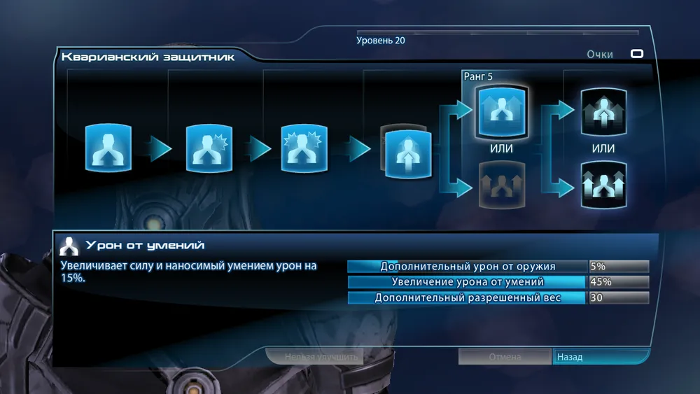 Кварианского защитника качаем на урон от умений и +30 к кулдауну оружия. Т.к. спамить связками это его конек.