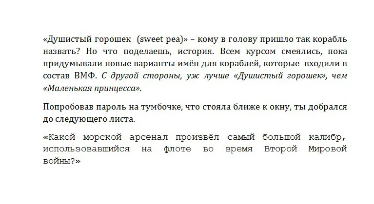 С крейсером USS Portland связана еще одна, менее известная, но очень занятная деталь: что моряки прозвали этот корабль «Душистый Горошек» или 'Sweet Pea'. Именно слово «sweet» не доставало на фотографии, оно же являлось следующим паролем. Судя по комментариям, на этом месте многие начали «буксовать», однако, в итоге все же смогли догадаться и пошли дальше.