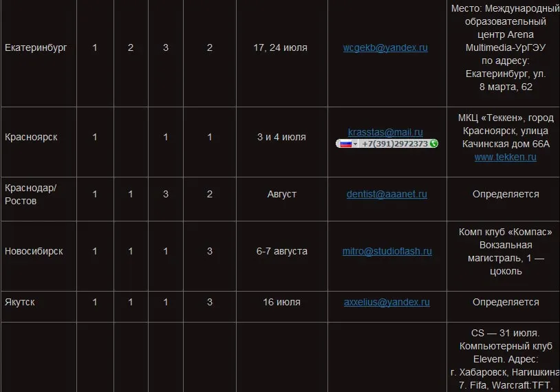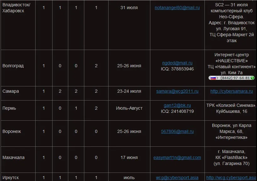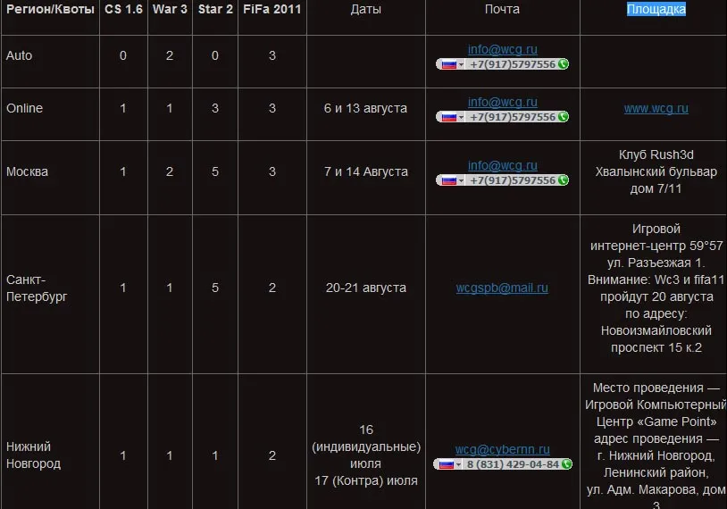 На сайте wcg.ru орг. комитетом была опубликована сводная таблица по региональным турам WCG 2011. В таблице можно узнать квоты по турнира, места проведения, а так же адреса организаторов. И пусть победит сильнейший.
