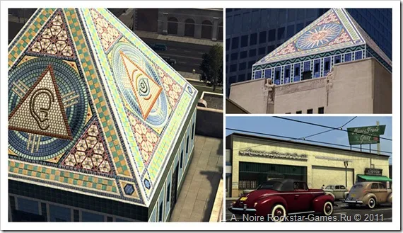 Справа: Показан сабор D.W. Griffith’s "Intolerance" часть Голливудской истории, данная декорация использовалась во многих исторических фильмах. Так же предоставлена в одной из перестрелок в L. A. Noire.