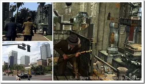 Cверху слева: Детективы Фелпс и Гэллоуэй бегут по Першинг-Сквер в L. A. Noire.