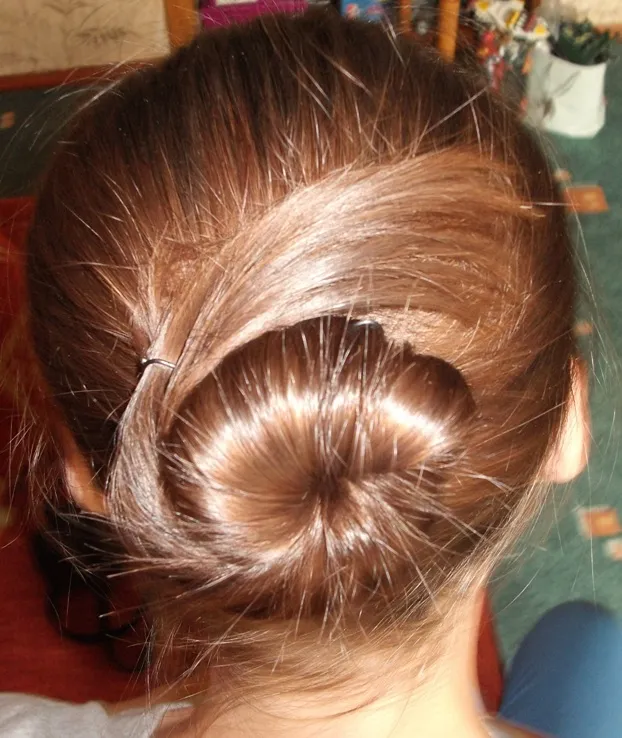 5. Теперь скручиваем хвост и оборачиваем его вокруг резинки так, чтобы концы оказались сверху. Фиксируем шпильками. Пучок готов!