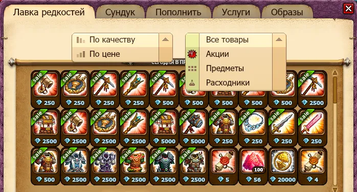 Теперь второй фильтр - онсостоит из 4 вкладок - все товары, акции, предметы, расходники.