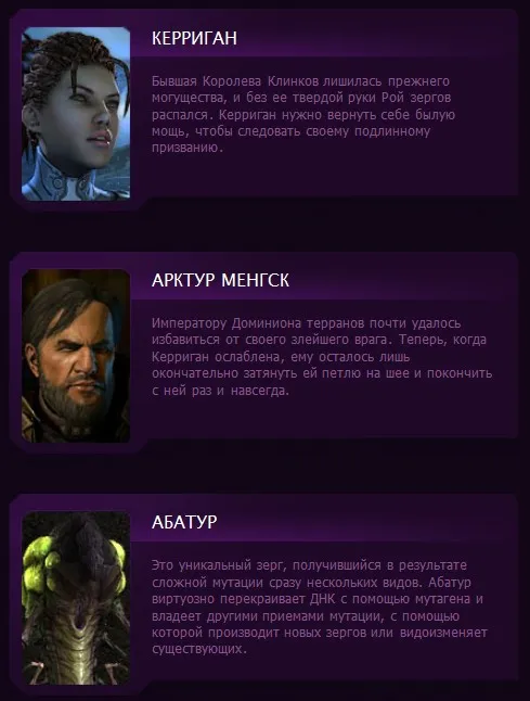 Кроме Керриган на скриншотах можно видеть заснеженную планету и здания в энергетических коконах. Видимо сама кампания будет не сильно отличаться от игры за терранов: Керриган тоже будет летать по космосу в космическом корабле, который является вполне живым существом. Зовут его Левиафан (Leviathan). Вместе сКерриган в его чреве обитают и ее советники Изша (Izsha) и Абатур (Abathur), которых раньше и не существовало.