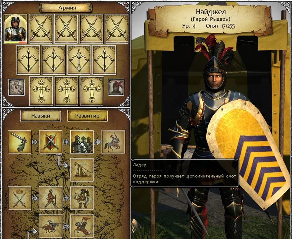 До каких пределов тренировать героя? Я предпочёл довести его до седьмого уровня; причём в первую очередь развивал верхнюю ветку навыков, чтобы на пятом взять в отряд дополнительного бойца, а на шестом – улучшить возможность штурма укреплений.