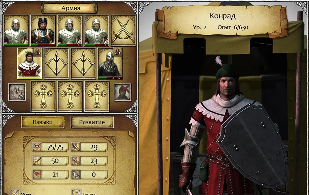 Конечно, воинов будут ранить. Но на какие шиши прикажете их лечить – все здания под контролем у врага? И на что покупать экипировку? Приобретаем в церквях и на рыках различной крепости вина и всяческие недорогие зелья – лишь бы они, помимо прочего, восстанавливали хотя бы пять единиц жизни. Даём выпить раненому и оставляем пьяного в здании; пусть трезвеет и лечится. Процесс идёт медленно, но все же идёт – под гневными взглядами священников: как же, лишили «законной» прибыли! А тем временем свиту рыцарю составляют другие бойцы.