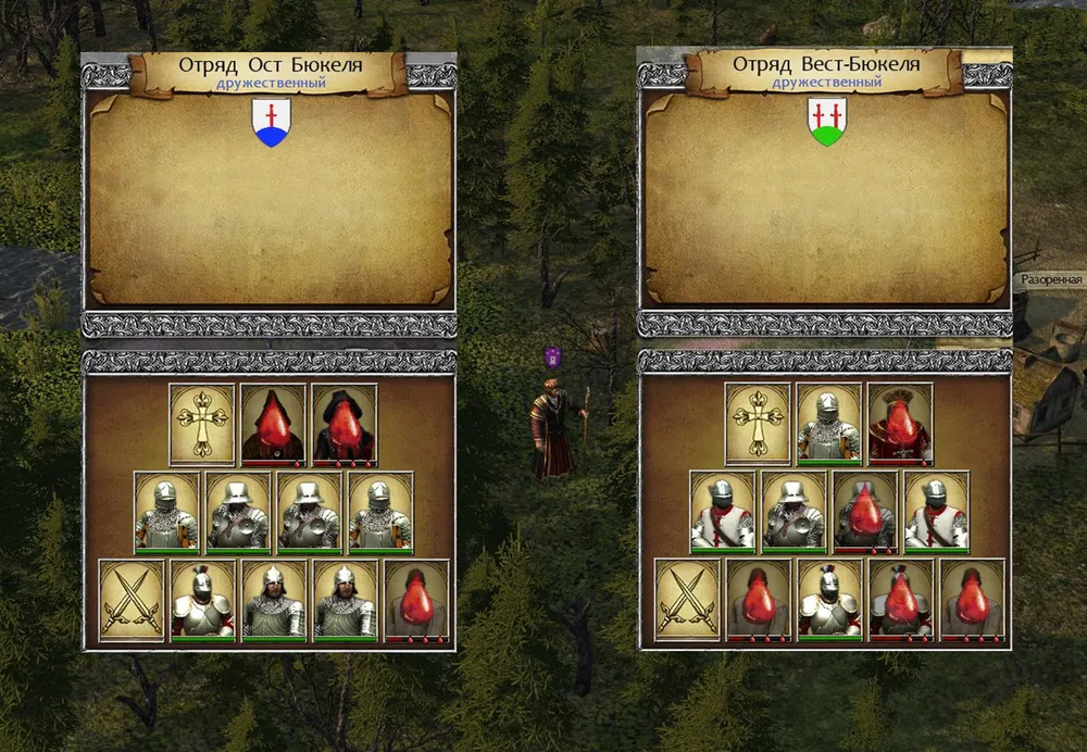 Проходя игру не в первый раз, я ухитрился сделать неожиданное открытие: состав наёмников в этом замке время от времени меняется! Не верхний слот с двумя дворянами, а нижний. Если прийти туда через двое-трое суток, то очень может быть, что удастся нанять тяжёлого пехотинца, разбойника или даже атамана. Для меня так и осталось загадкой, почему это можно сделать только здесь: на всех остальных картах бойцы «разбойничьей» ветки доступны исключительно в тавернах и за постоянную плату. А нанимаемые в деревнях крестьяне попросту не желали становиться разбойниками.